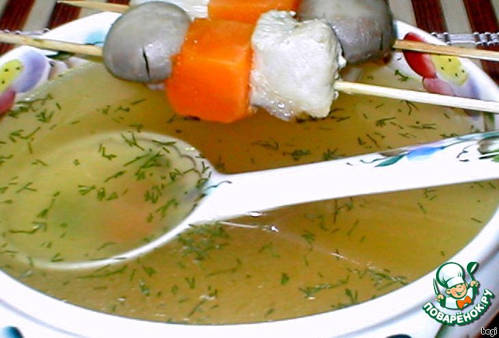 5. Ваш бульон "Модерн" готов. Процедите его, разлейте по тарелкам, положив на край шампуры с готовым мясом и овощами.