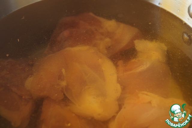 Курицу моем, заливаем водой и варим 30-40 минут, периодически снимая пену. Я предварительно снимаю кожу, не люблю её, варёную...