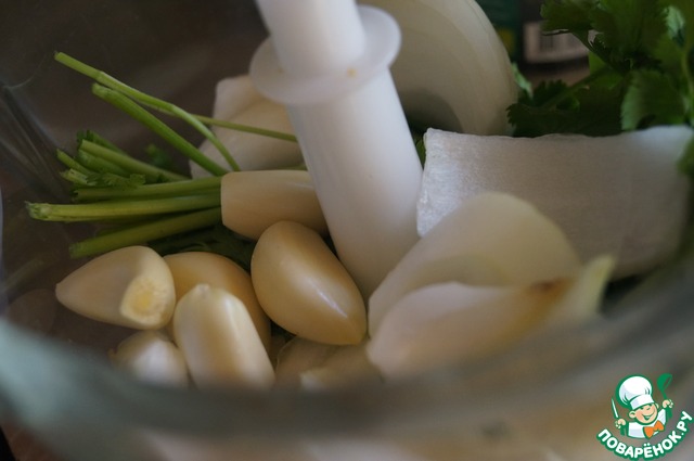 Кинзу, лук и чеснок помещаем в измельчитель или в чашу блендера.