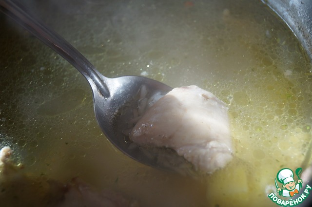 Из курицы удаляем кости, делим на куски и снова закладываем в суп. Суп пока вполне обычен и не поражает глаз и обоняние. Варим до готовности картофеля при несильном кипении.