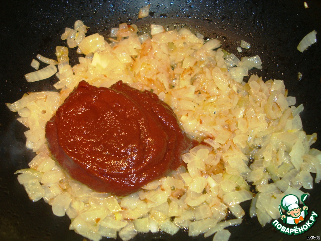 Лук нарезать кубиками и обжарить на сливочном масле до золотистого цвета. Добавить томатной пасты и все вместе потушить.