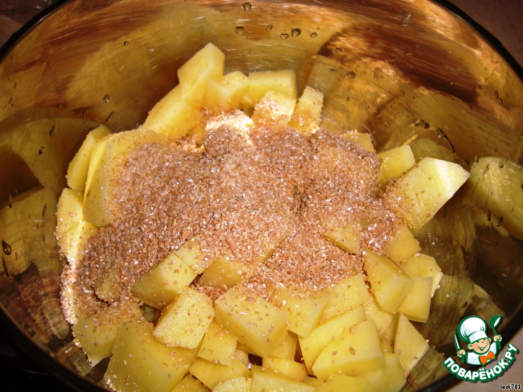 В другую кастрюлю положить нарезанный кубиками картофель и пшеничную крупу. Залить 1 литром воды и варить на медленном огне до готовности картофеля и крупы.