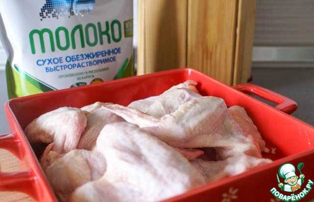 Итак, куриные крылышки, выложенные на противень, пересыпать 4 столовыми ложками сухого молока и отправить в предварительно разогретую до 180 градусов духовку на 30-40 минут до хорошего зарумянивания.