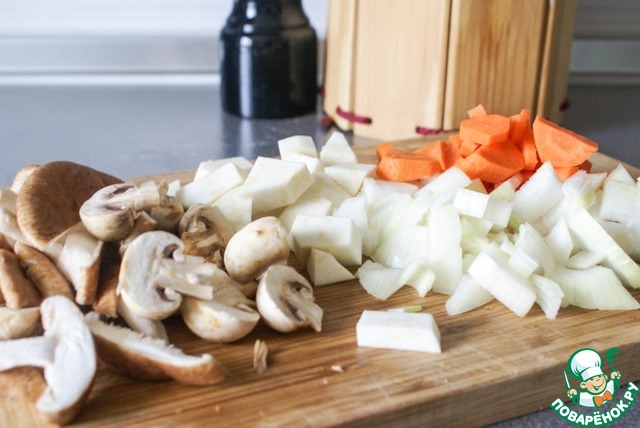 Все овощи и грибы крупно нарезать.