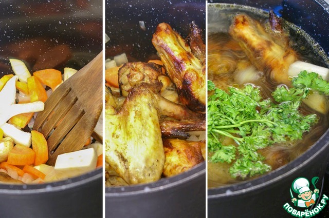 Обжарить овощи и грибы на разогретом масле около 5 минут (по желанию поперчить), до легкого зарумянивания. Добавить в кастрюлю куриные крылья, содержимое деглазированного противня, залить водой, добавить специи и зелень (в зависимости от ваших пожеланий - тимьян/розмарин/лавр овый лист/душистый перец, я использую веточки петрушки), довести до кипения, закрыть крышкой, уменьшить огонь и варить около 2ух часов на слабом огне.