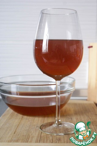 Когда крылышки будут готовы, извлечь их из противня и деглазировать содержимое противня путем добавлением воды (я использую белое сухое вино). Деглазировать - значит влить жидкость в посуду, где жарился продукт и остались "прижарки", помогая себе лопаткой соскрести их и растворить в жидкости.