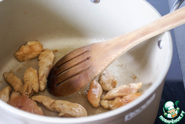 Разогреть в кастрюле ложку растительного масла, выложить курицу и быстро обжарить.