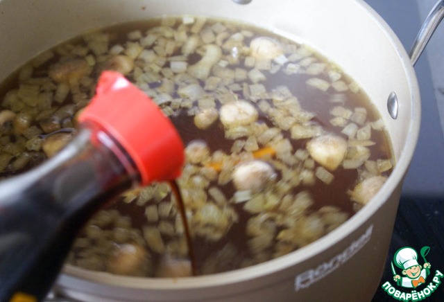 Залить разогретым бульоном (поскольку он достаточно насыщенный, его можно разбавлять водой по вкусу), влить соевый соус по вкусу, довести до кипения.