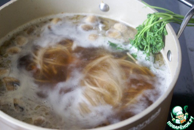 В кипящий бульон опустить гречневую лапшу или всыпать гречку.