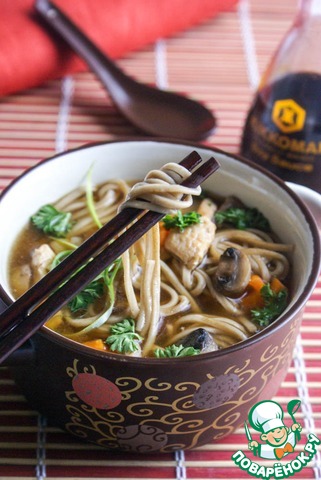| Если вы никогда не пробовали заменить лапшу на гречку в стандартном курином супе-лапше - обязательно попробуйте. Гречка заставляет "звучать" этот суп совершенно по-новому. Ну а пока я предлагаю вам ознакомиться с рецептом приготовления куриного супербульона для этого и множества других супов. На нем мы и приготовим ту самую "лапшу/гречку", а также раскроем вкусы простых продуктов с помощью соевого соуса. |