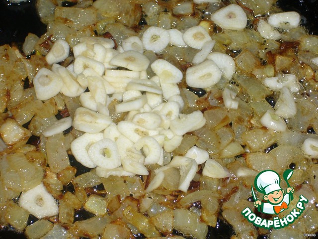 Очистить чеснок, порезать его тонкими колечками и добавить к обжареному луку. Накрыть крышкой и дать потомиться 1-2 минуты.