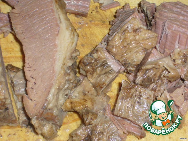 Достать мясо, порезать на небольшие кусочки, выложить обратно в бульон.