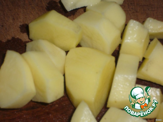 Картошку очистить, порезать на средненькие кубики и выложить в кастрюлю.