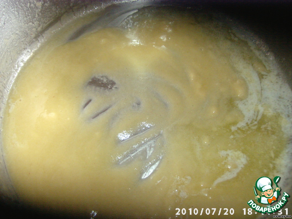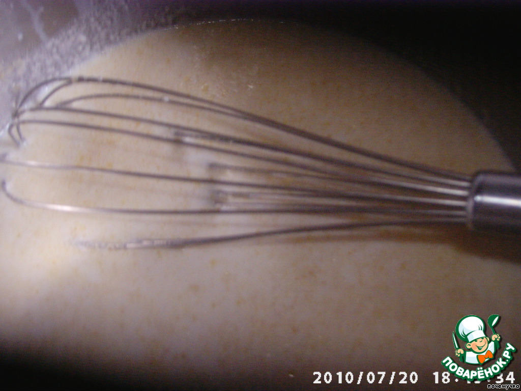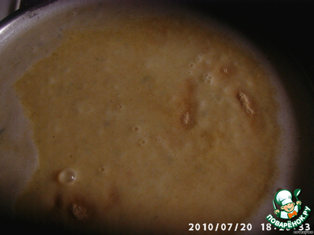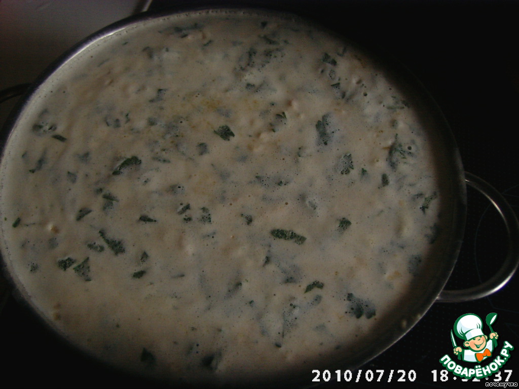 Снять с огня, постепенно влить молоко, тщательно перемешать. Процедить, ввести бульон. Довести до кипения, убавить огонь.