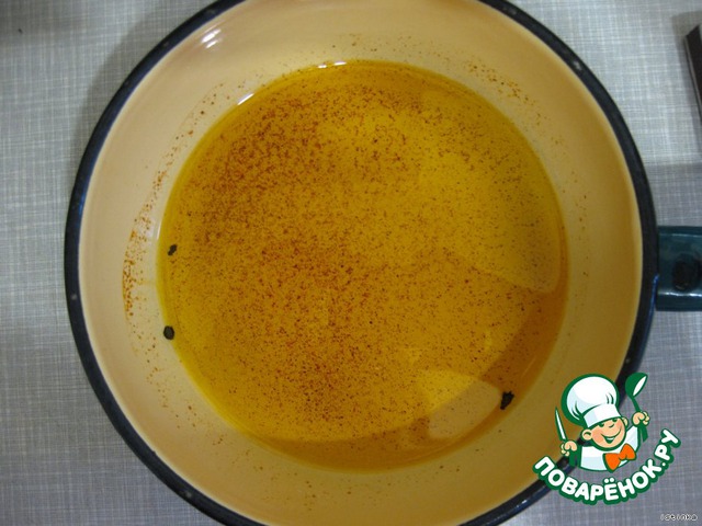 Паприку слегка (2-3 мин.) поджариваем на растительном масле, чтобы она отдала немного маслу цвет, но ни в коем случае не почернела. Остужаем и добавляем в кефир.