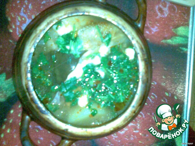Когда будет готово, посыпаем зеленью и мелко нарубленным чесноком, накрываем крышкой и даем чуточку настояться!