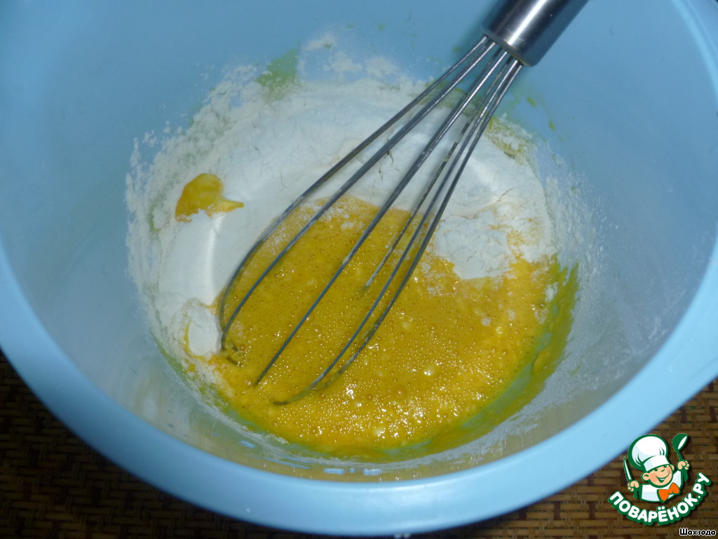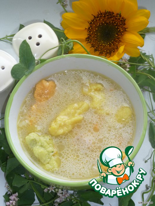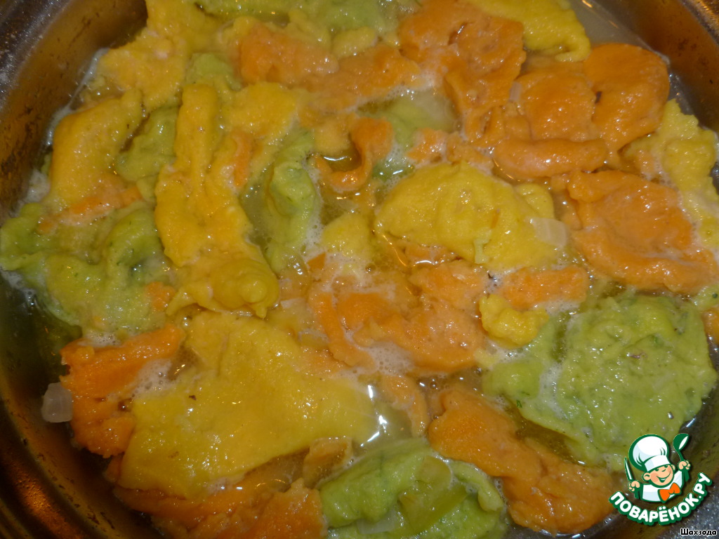 Приготовить цветные клецки: яйца взбить с мукой (посолить по вкусу).
