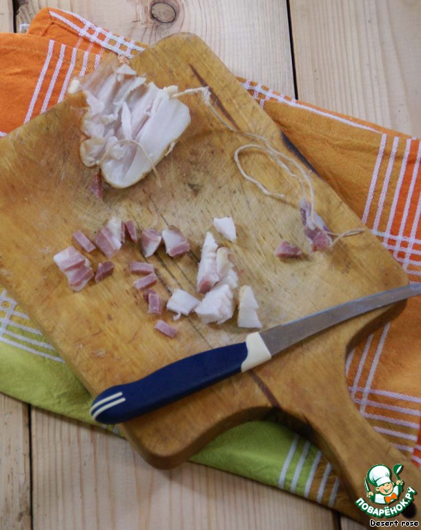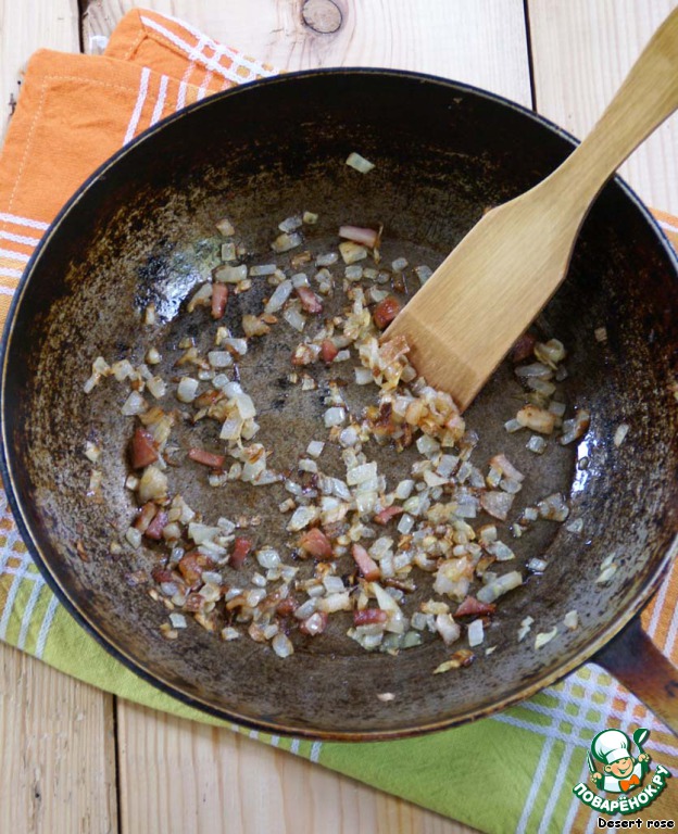 Растопить на сковородке сало и обжарить на нем лук до золотистости.