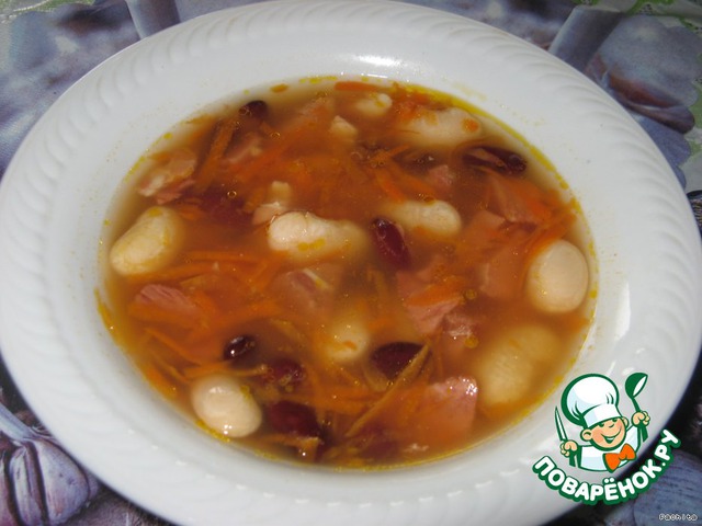 | Густой сытный супчик с двумя видами фасоли и ароматом копчeностей. |