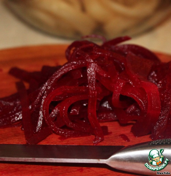 Также заранее готовим свекольный настой. Нарезаем тонкой соломкой вареную свеклу, заливаем кипяченой холодной водой, накрываем пленкой и убираем на чутки (можно на ночь) в холодильник.