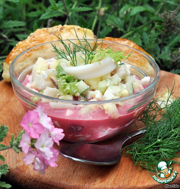 | Выходные - это настоящий праздник в нашей семье, когда все собираются вместе... и тут надо угодить всем: несмотря на жару, нужно приготовить обед, который будет легким и в то же время сытным... интересным и праздничным... простым в приготовлении и неожиданным... Итак, овощи и фрукты, зелень и листья салата, с пикантной ноткой кальмаров... в интересной заправке из свекольного настоя с домашним квасом, вприкуску с мягкими и нежными сырными булочками с орехами... |