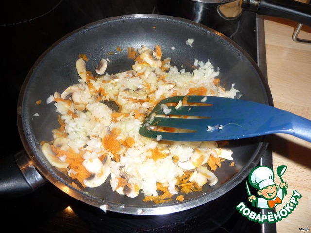В сковороде жарим грибы, лук и тертую на терке морковь.