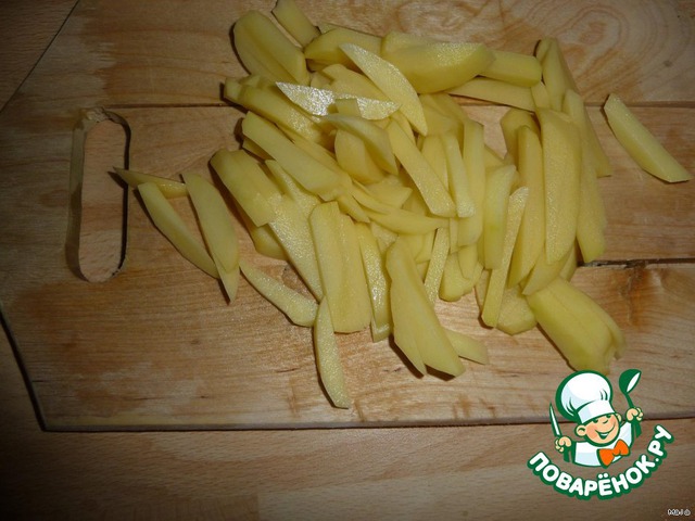 Режем картофель соломкой и добавляем в кастрюлю к мясу.