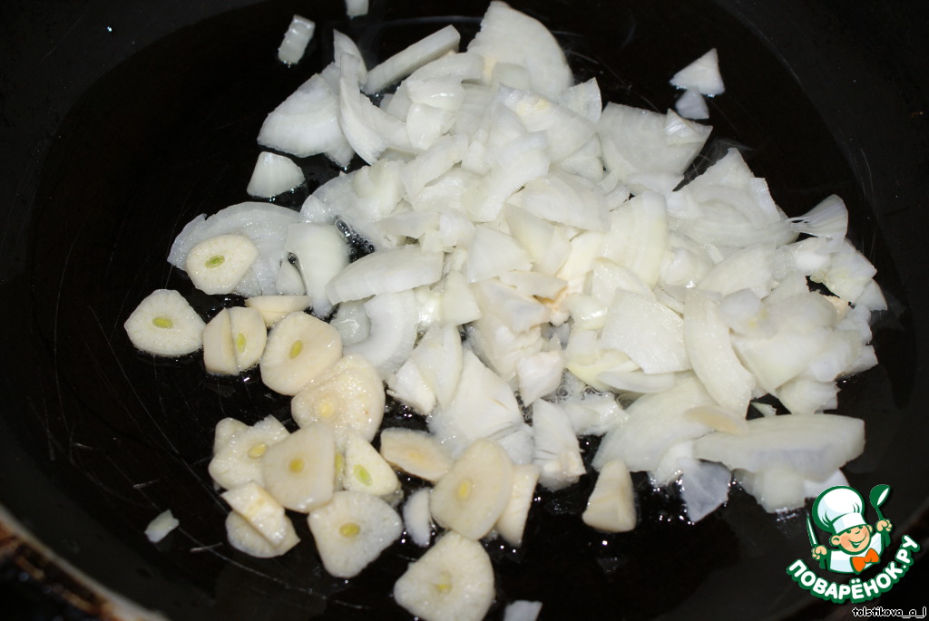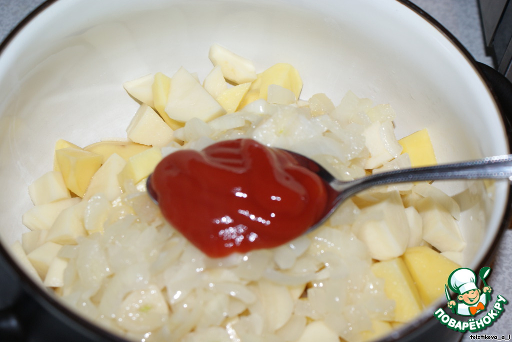 Почистить картофель, порезать его кубиками и уложить в кастрюлю. Добавить обжаренные лук с чесноком, томатную пасту и залить все 3 стаканами воды. Поставить на огонь и варить до готовности овощей.