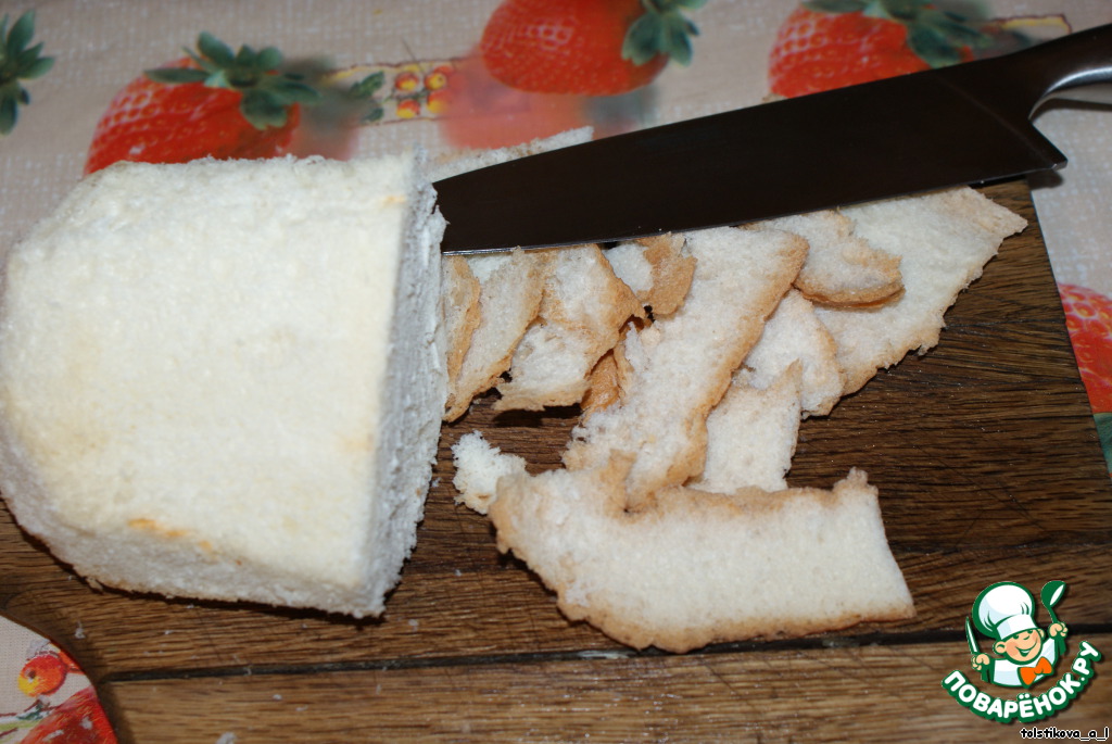 Для гренок обрежем корочку с белого хлеба и порежем его кубиками. Обжарим наши кубики в сливочном масле.