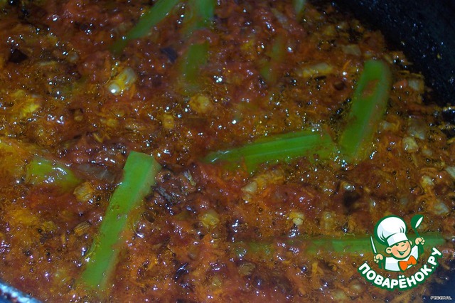 В сковороде обжарить лук с морковью, потом добавить томат-пасту, порезанный на четверушки сельдерей и потушить пару минут.