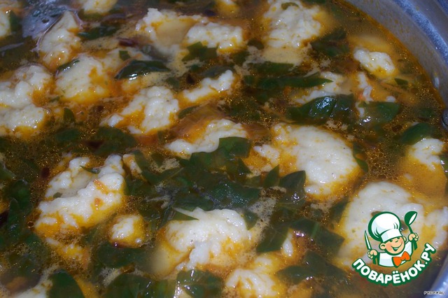 К готовому картофелю в бульон чайной ложкой кладём тесто, когда закипит и тесто поднимется, добавляем шпинат и зажарку, даём покипеть на маленьком огне 10 минут.
