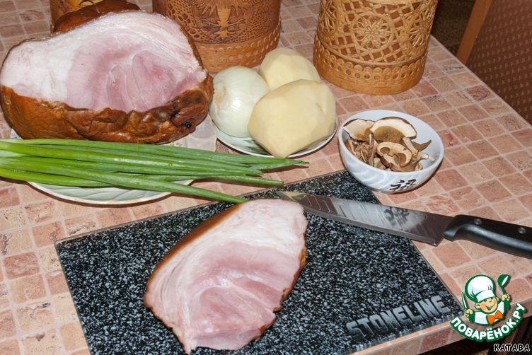 Для нашего ароматного супа нам понадобится: грамм 300 вкусной мясной рульки, белые грибочки (у меня сушеные), картофель пару штук, лук - репчатый и зеленый. Еще сметана и мука (их нет на фото). Вот такой аппетитный наборчик.