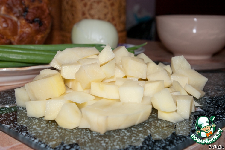 Ставим кастрюлю с водой (у меня трехлитровая) на плиту. И тем временем нарезаем картофель кубиками.