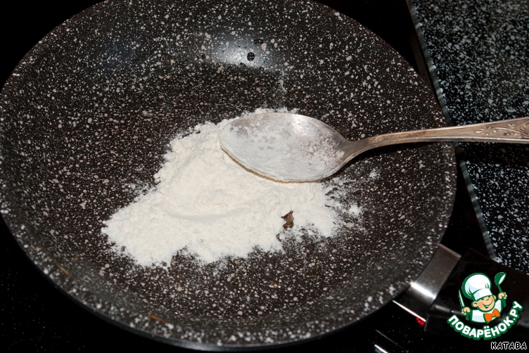 В дополнение мы сделаем заправку для супа. В принципе, это по желанию. Но с ней суп вкуснее. Для этого нальем полстакана бульона из кастрюли и охладим. На сухую сковороду насыпаем 1 столовую ложку муки (больше не нужно) и обжариваем на среднем огне. Чуть помешиваем, чтобы не пригорела.