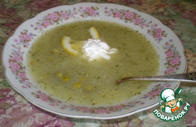 нагревать еще 1 мин при полной мощности. Заправить зеленью петрушки и лимоном. Я тоже их в блендере перемолола. Посыпаем консервированным зеленым горошком