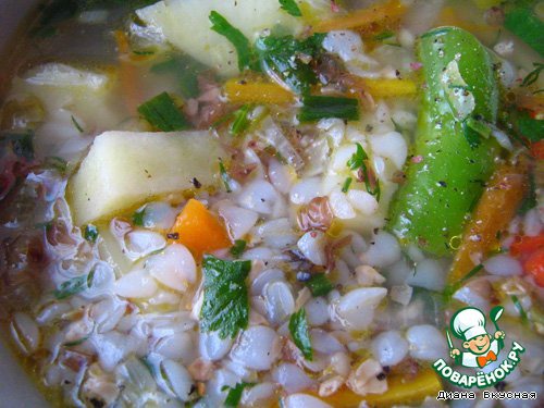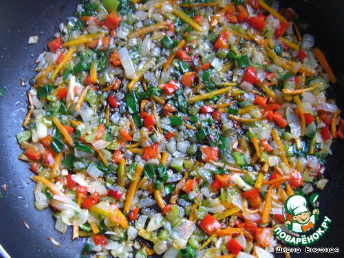 В двух литрах воды варим гречиху и нарезанную брусочками картошку с лавровым листом. Мелко шинкуем лук, морковь, болгарские перцы и поджариваем