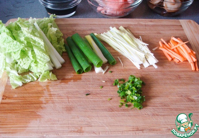 Тем временем нарезать овощи соломкой. Дополнительно измельчить горсть зеленого лука.