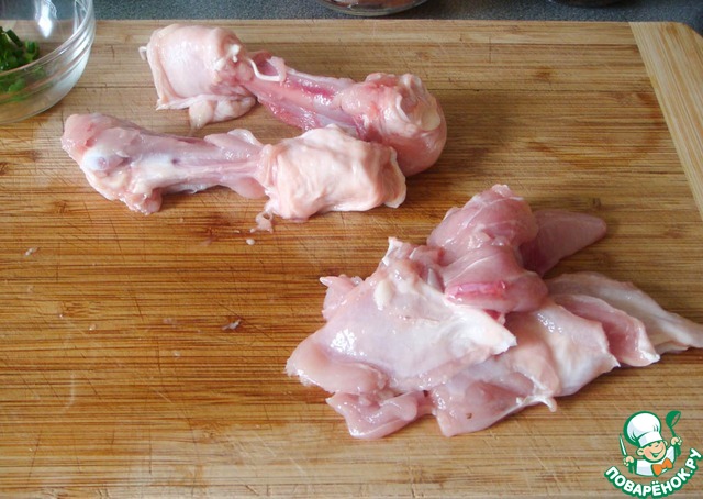 С куриных голеней срезать кусочки мяса.