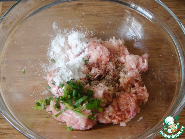 Смешать полученный фарш с горстью нарезанного зеленого лука, добавить 3 ч. л. соевого соуса, соль и перец по вкусу, добавить ложку крахмала и хорошо перемешать.