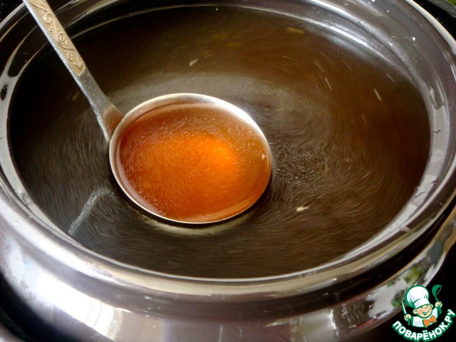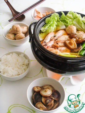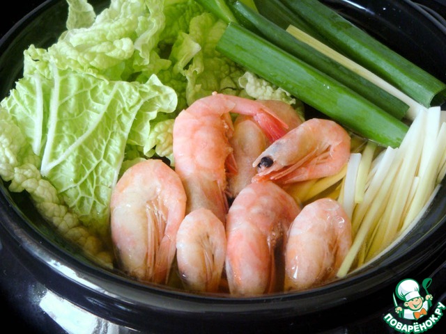 Поставить на огонь котелок/горшочек/тол стостенную кастрюлю, в которой будет подаваться блюдо, и влить в нее подготовленный бульон. Добавить соевый соус. Довести до кипения.