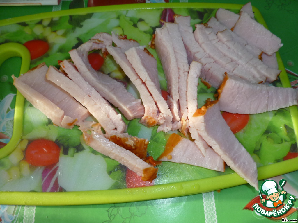 Нарезать ветчину небольшими кусочками, обжарить в растительном масле.