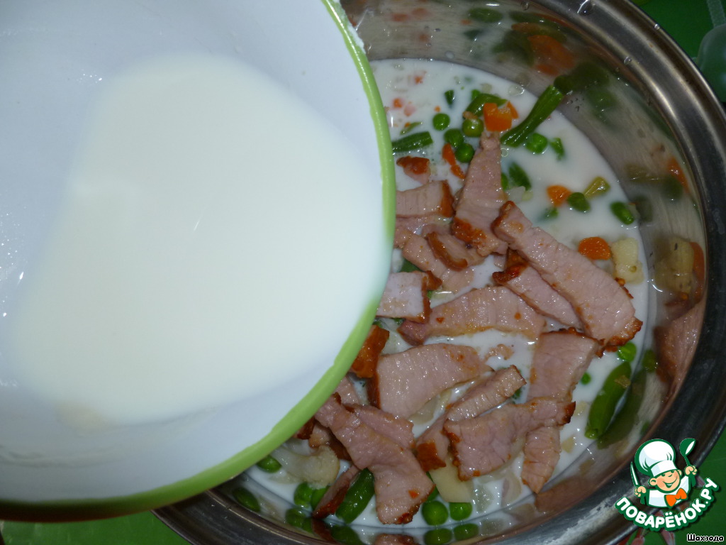 Смешать с молоком, залить мясо с овощами, варить до готовности. За 5 мин. добавить лавровый лист, перец и мускатный орех. Украсить зеленью.