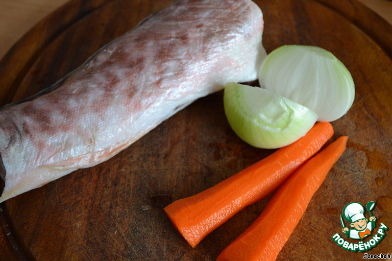 Для бульона необходим кусочек рыбы (помытой и почищенной), лук репчатый и морковь, разрезанные пополам.
