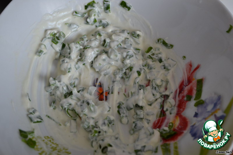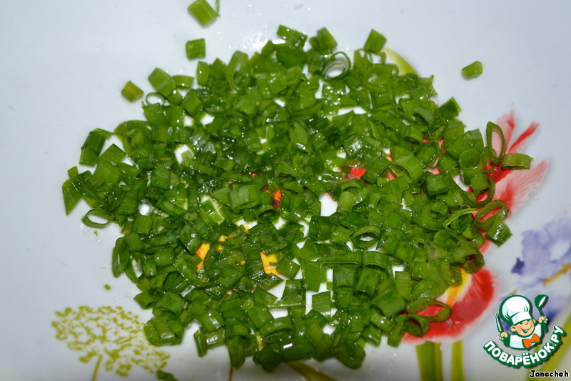 Зеленый лук мелко нарезать, положить в супницу, растолочь.