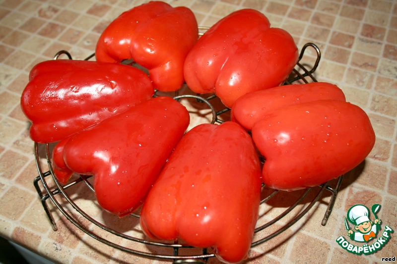 Помыть перцы, разрезать их пополам, очистить от семян. Выложить на решетку срезами вниз. Запекать в духовке 20 минут при температуре 250 градусов.