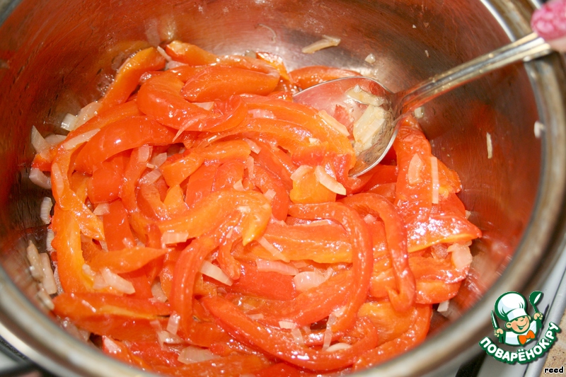 Обжарить лук с чесноком на подсолнечном масле. Перец одного цвета очистить от кожуры, нарезать его на полоски и добавить к луку. Тушить 5 минут. Затем добавить 200 г воды, 1 столовую ложку лимонного сока и половинку куриного кубика (можно добавить и овощной бульон), посолить, поперчить, насыпать сахар. Хорошо перемешать и тушить под крышкой 20 минут.