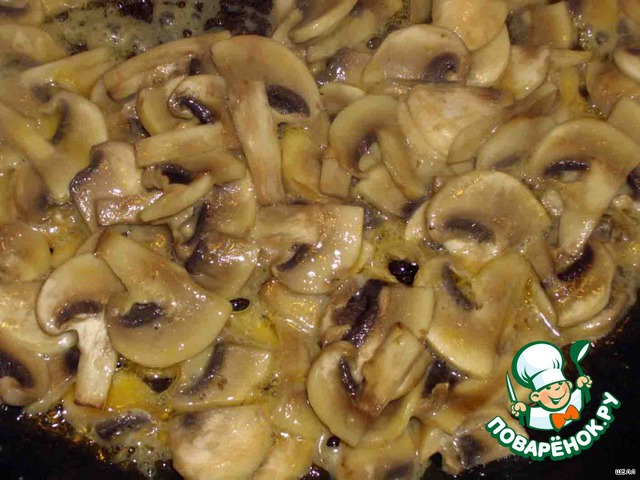 Нарезаем грибы тонкими пластинками, обжариваем их на сливочном масле на большом огне, постоянно помешивая.