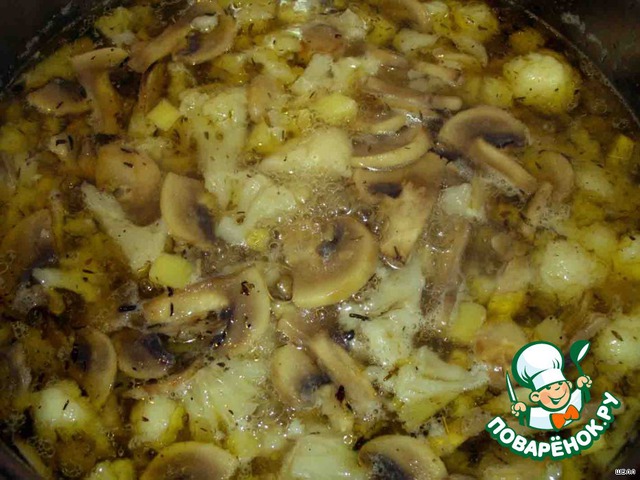 | Еще один из любимых супчиков моего семейства. Получается он нежный, сливочный, с грибочками. Готовить его довольно быстро и просто. Вся "фишка" вкуса в тимьяне. |