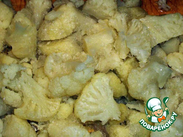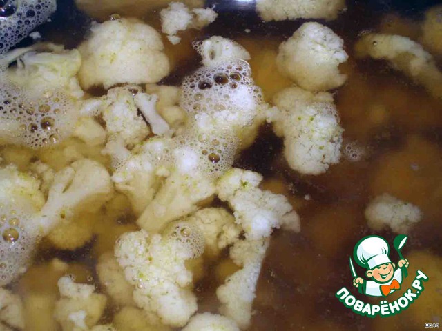 Чистим капусту, нарезаем на небольшие соцветия (у меня была мороженая). Ставим кастрюлю с водой на плиту.