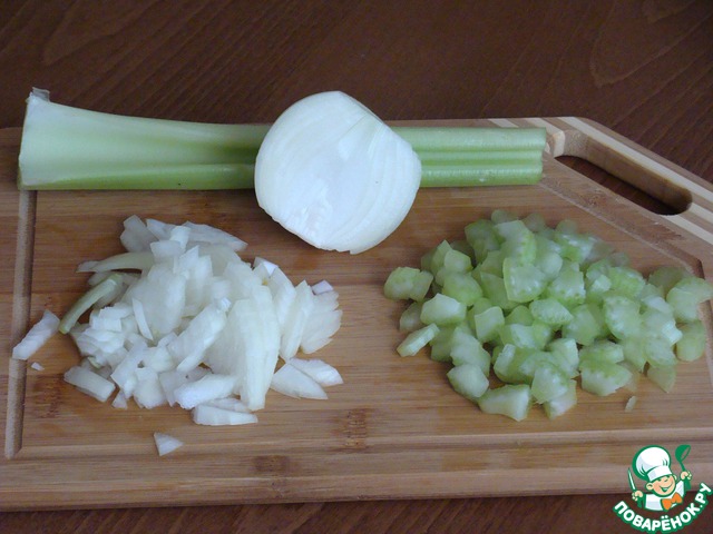 Половину луковицы и один стебель сельдерея нашинковать и спассеровать на оливковом масле.